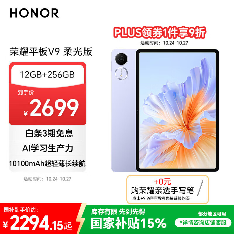 荣耀平板V9 柔光版【国家补贴】11.5英寸平板电脑 绿洲护眼屏 超轻薄长续航 12GB+256GB 庐烟紫