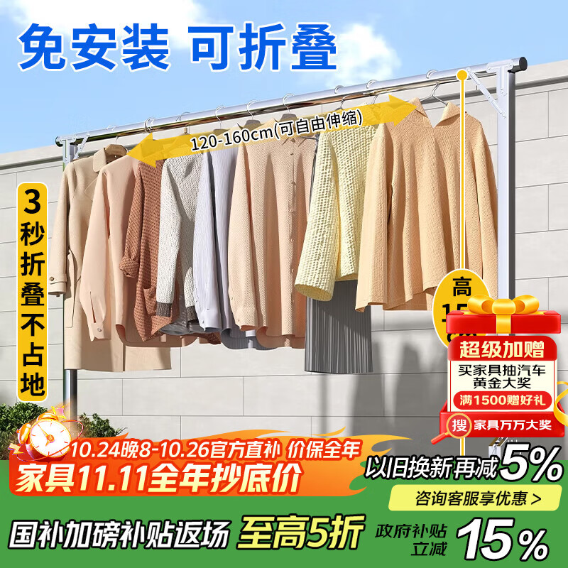 京佳宜落地晾衣架【免安装伸缩1.6米】室内阳台晒衣架不锈钢折叠晒被架