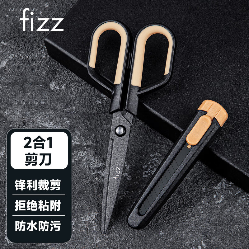 飞兹(fizz)特氟龙多功能剪刀组合装美工刀+剪刀二合一办公家用裁剪两用不锈钢黑色 FZ21215