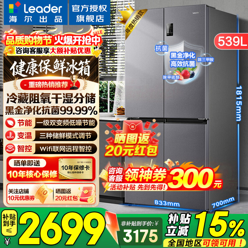 海尔冰箱出品统帅539升四开门十字对开门560嵌入式冰箱风冷无霜一级双变频干湿分储Leader电冰箱 阻氧干湿分储+黑金净化+一级双变频