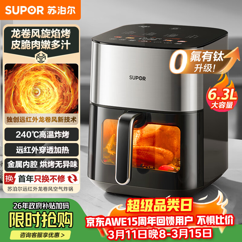 苏泊尔(SUPOR)空气炸锅免翻面6.3L家用多功能全自动炸烤一体机远红外可视电炸锅蒸汽嫩炸KD63Y891
