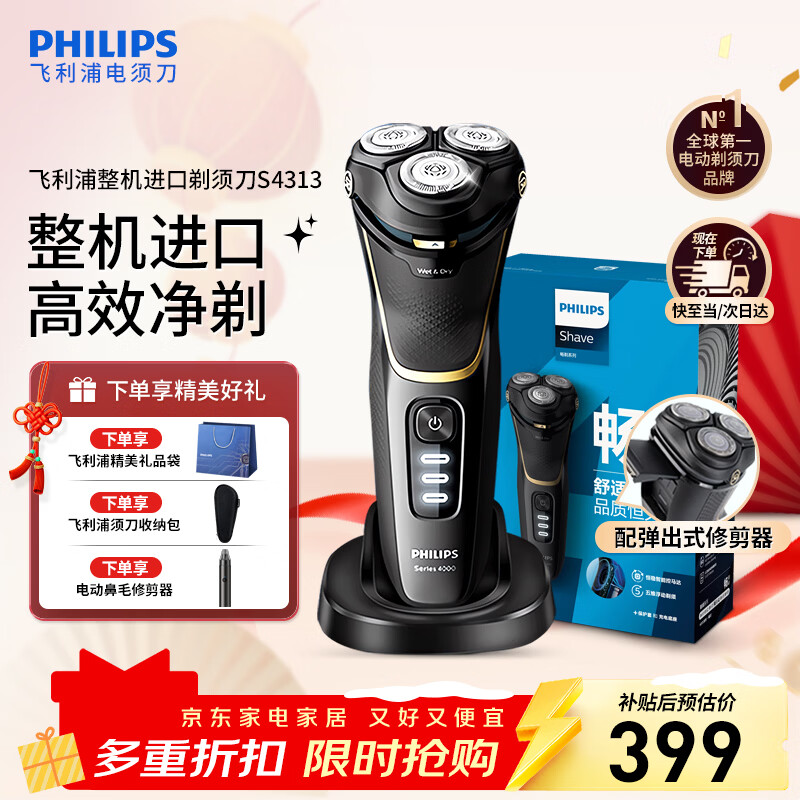 飞利浦(PHILIPS)【整机进口】剃须刀电动刮胡刀胡须刀男士高端全身水洗快充送父亲老公男友新年礼物情人节礼物 【进口4系】S4303升级款S4313/13