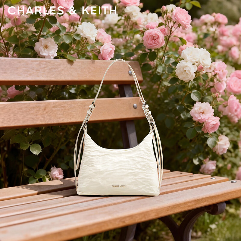 CHARLES&KEITH褶皱油蜡皮手提单肩腋下包女生日礼物送女友CK2-40271360 Cream奶白色 M