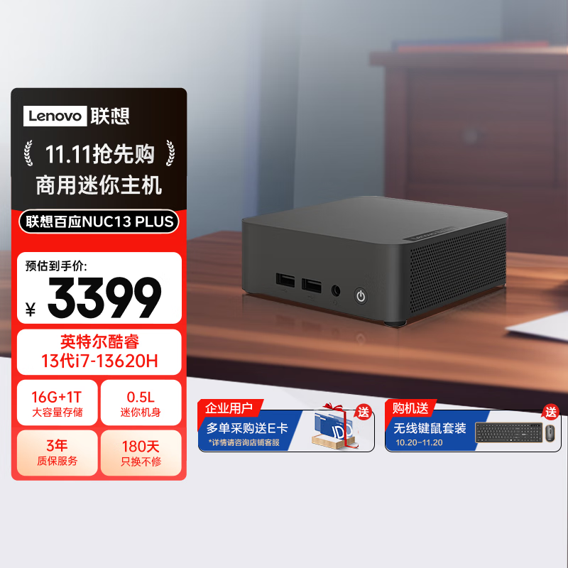 联想百应NUC mini迷你口袋主机商用家用台式电脑(酷睿13代i7-13620H 16G 1T)