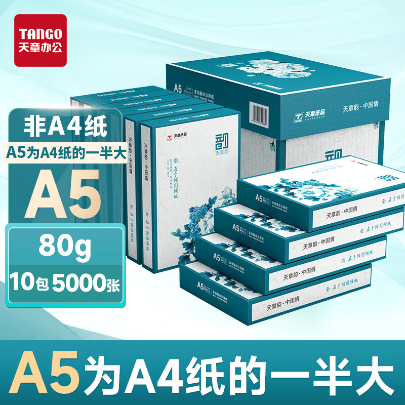 天章 (TANGO)绿天章韵 a5打印机纸80g/70g500张 单包双面复印纸 电子发票打印纸 财务凭证纸非a4规格 【A5/80克】绿天章韵/5000张/10包/箱