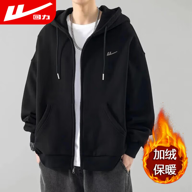 回力外套男加绒加厚保暖冬季连帽卫衣男宽松休闲针织开衫运动外套