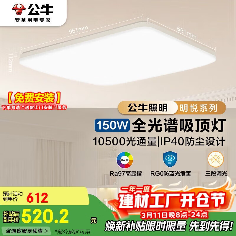公牛(BULL)吸顶灯 X19系列 MX-B150D-ES 超薄三段调光客厅卧室灯150W 送安装