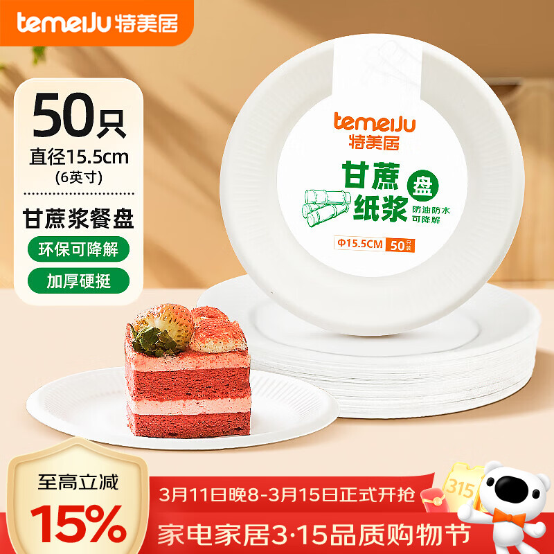 特美居(temeiju)6英寸一次性盘子蛋糕纸盘碟可降解餐盘户外野餐盘餐具50只15.5cm