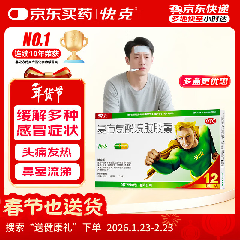 快克 复方氨酚烷胺胶囊12粒 感冒药鼻塞流涕打喷嚏 流感药 感冒咳嗽 头痛发热 咽痛 抗病毒用药 解热镇痛