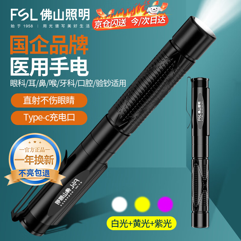 FSL瞳孔笔灯医护手电筒专用耳鼻喉眼口腔医生护士晨检笔可充电三色光