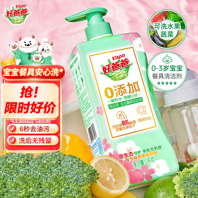 好爸爸(Kispa)果蔬餐具净雪樱白茶1kg洗洁精 去油不伤手0添加食品可用家庭清洁