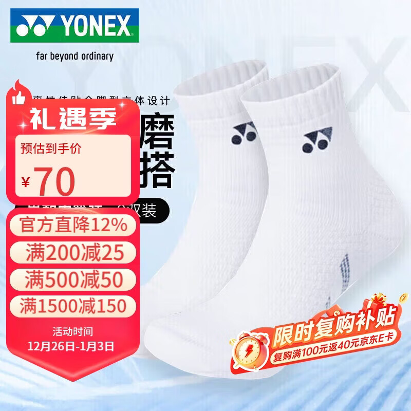尤尼克斯YONEX羽毛球袜吸汗透气加厚中筒情侣袜男款145105BCR白2双装