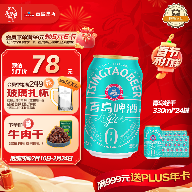 青岛啤酒轻干啤0糖330ml*24罐原麦汁浓度8.0°P无糖年货送礼 新老包装随机