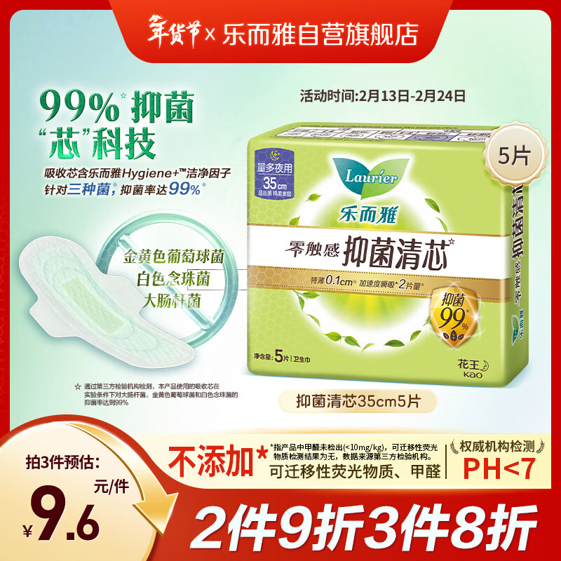 乐而雅花王零触感抑菌清芯夜用卫生巾35cm5片祛味姨妈巾京东自营新国标