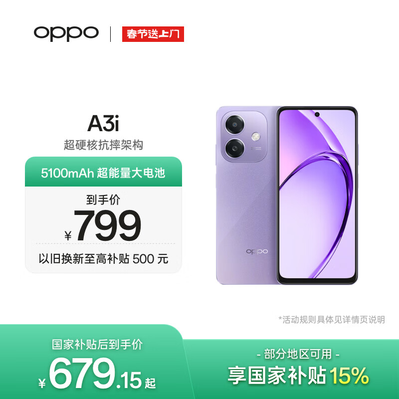 OPPO A3i 8GB+128GB 星辰紫 抗摔抗水溅 5100mAh大电池 45W闪充 120Hz高刷 5G 老人智能手机 国家补贴