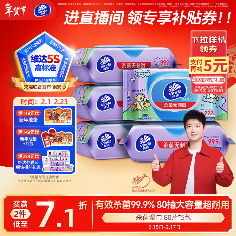 维达(Vinda)杀菌湿巾 80片*5包 线条小狗IP款 杀菌率99.9% 湿巾大包 湿纸巾