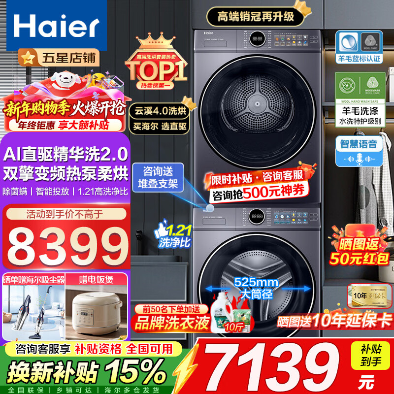 海尔(Haier)【云溪4.0顶配版】77E洗烘套装525大筒径洗烘一体机全自动直驱精华洗2.0滚筒洗衣机双擎热泵烘干机干衣机 77E套装|直驱精华洗1.21洗净比+3D透视烘干