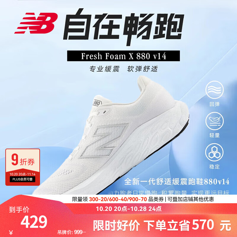 NEW BALANCE NB880 V14跑步鞋官方运动鞋男鞋秋冬透气缓震跑鞋Fresh Foam X 白色 男款 M880W14 标准鞋楦D 45 (男码脚长29cm)