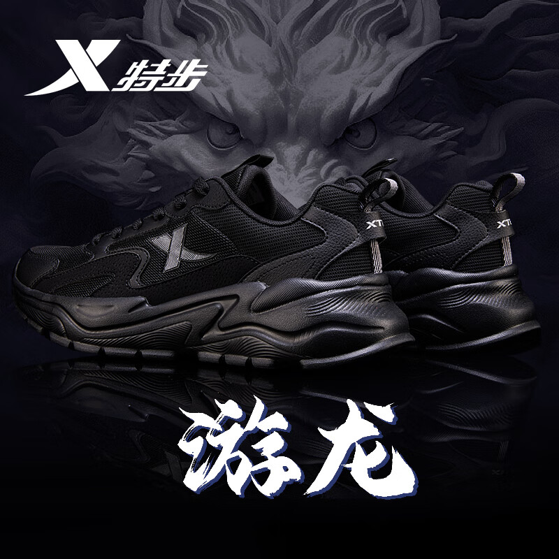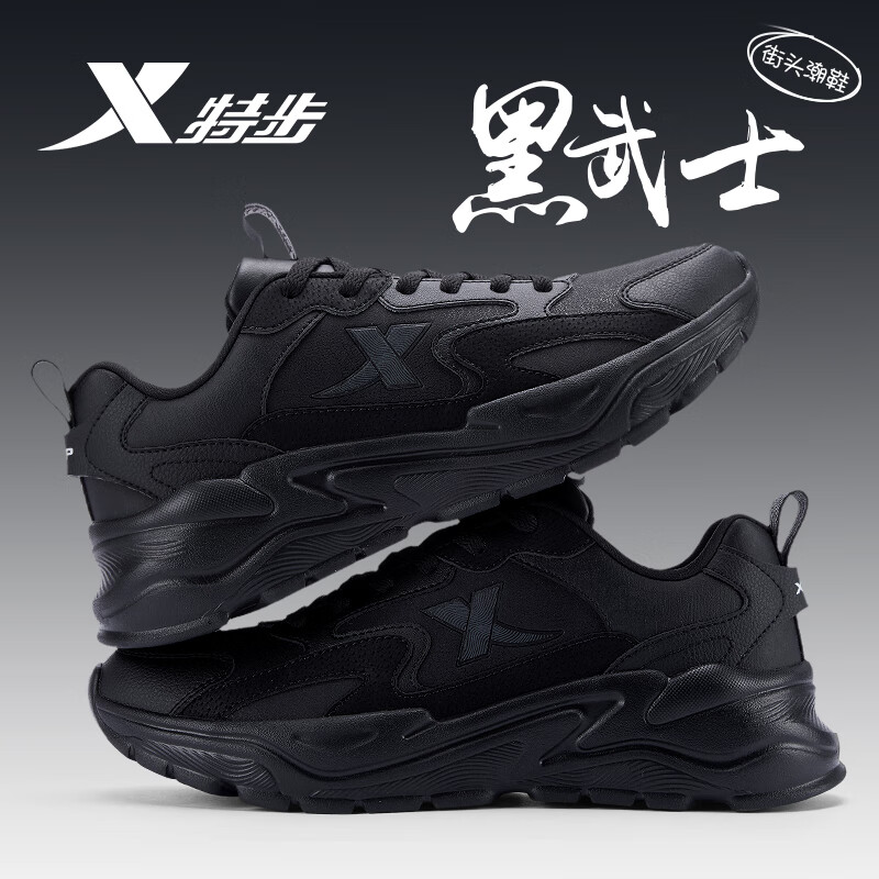 特步黑色运动鞋男鞋秋冬黑武士厚底增高老爹鞋软底通勤跑步鞋子休闲鞋 黑-山海2.0黑武士【防水皮面】 45