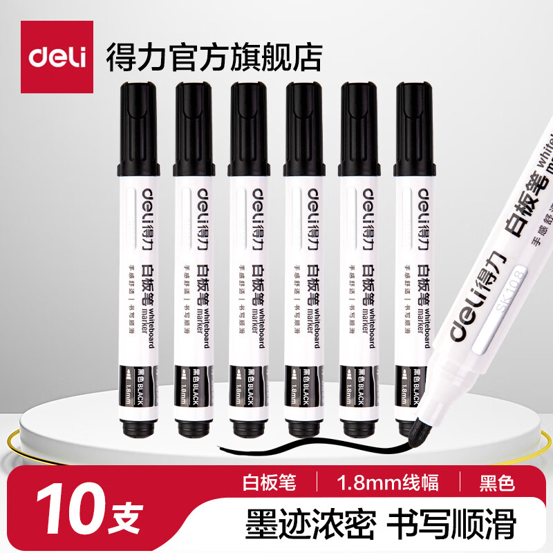 得力(deli)可擦白板笔会议教师用水性黑儿童彩色黑板笔画板写字易擦写粗头大头记号笔可擦除专用 1.8mm线幅【黑色10支】SK108