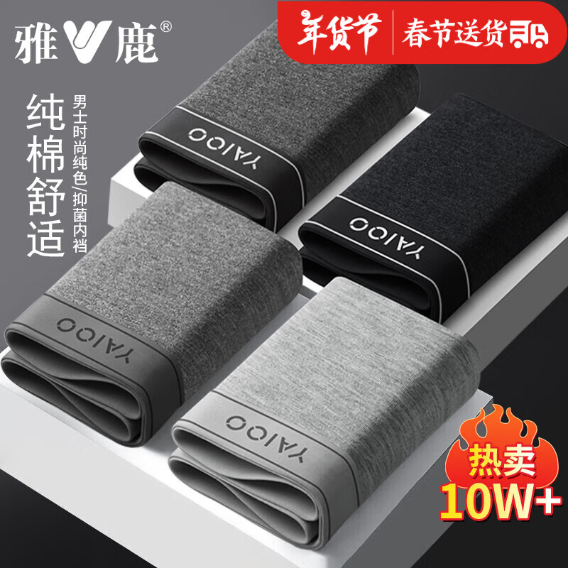 雅鹿男士内裤男纯棉经典灰色调透气宽松平角男式四角短裤衩四季 【默认4色】-袋装 CU864 4条 2XL 【建议120-140斤】