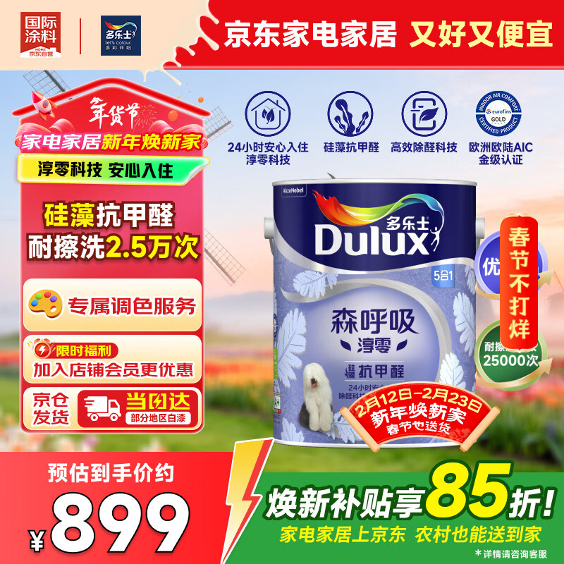 多乐士(Dulux)森呼吸淳零无添加硅藻抗甲醛五合一A8211高端内墙面漆 5L【白漆】