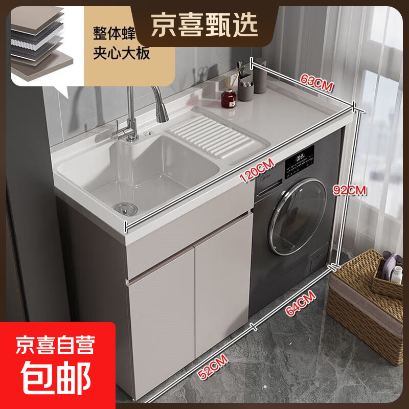 【京喜甄选】阳台洗衣柜蜂窝铝一体台盆洗衣池滚筒洗衣机柜浴室柜 卡其120CM单独下柜+双下水+抽拉水龙头【备注左右盆】