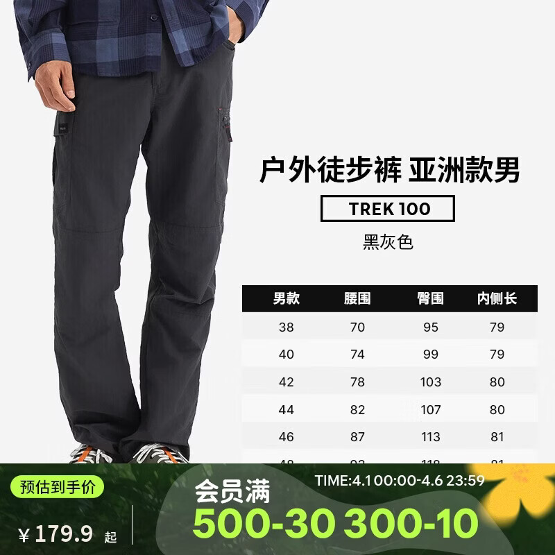 迪卡侬TREK100速干裤薄款户外徒步登山裤透气弹力男款黑灰色50-5164863