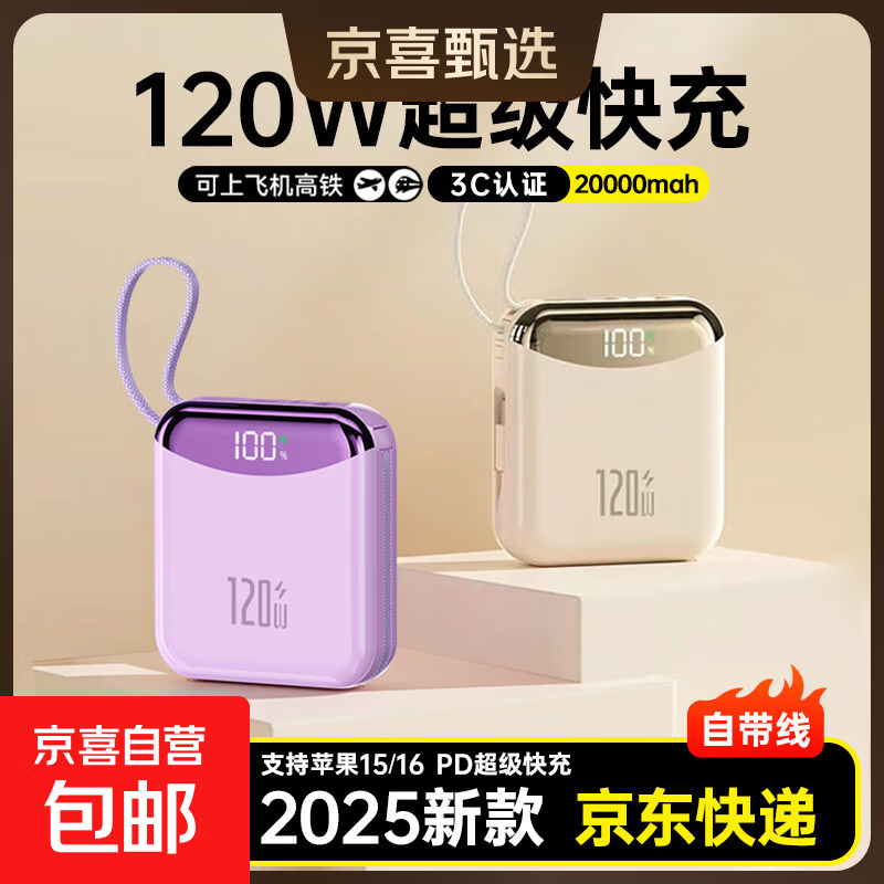 自带线充电宝快充3C认证1/20000毫安超薄小巧便携迷你超大容量适用于华为oppo小米vivo苹果16 芋泥紫【旗舰款/进口提速电芯】快充/自带线 20000ma
