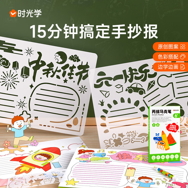 时光学15分钟搞定校园手抄报24张主题线稿配丙烯马克笔6色幼儿园小学生国庆节中秋节手抄报半成品神器