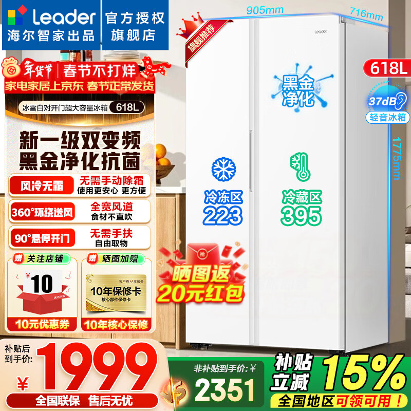 海尔冰箱出品统帅冰箱618升双开门对开门冰箱风冷无霜变频一级能效大容量白色Leader电冰箱以旧换新 冰雪白+一级双变频+黑金净化抗菌