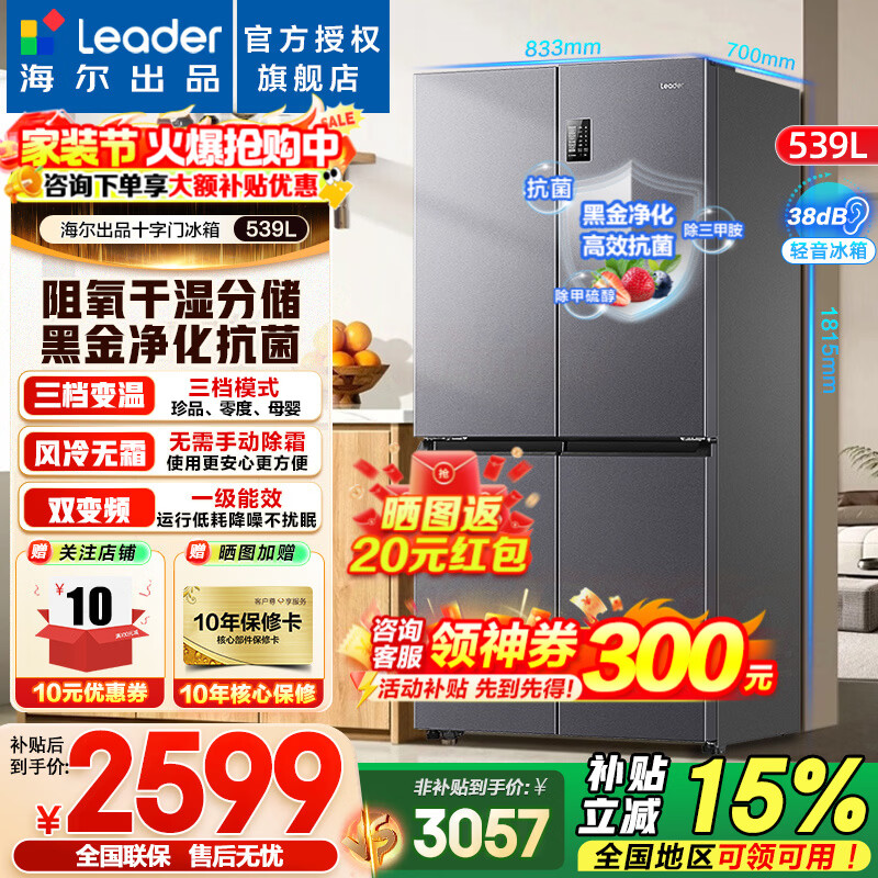 海尔冰箱出品539升四开门十字对开门风冷无霜一级双变频干湿分储统帅560电冰箱以旧换新 阻氧干湿分储+黑金净化+一级双变频