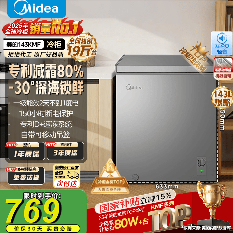 美的(Midea)200升单温家用冰柜减霜非无霜冷藏冷冻两用小冰柜一级能效节能冷柜100/143/200L小型冰箱国家补贴 143升 一级能效丨可冻肉200斤 143KMF