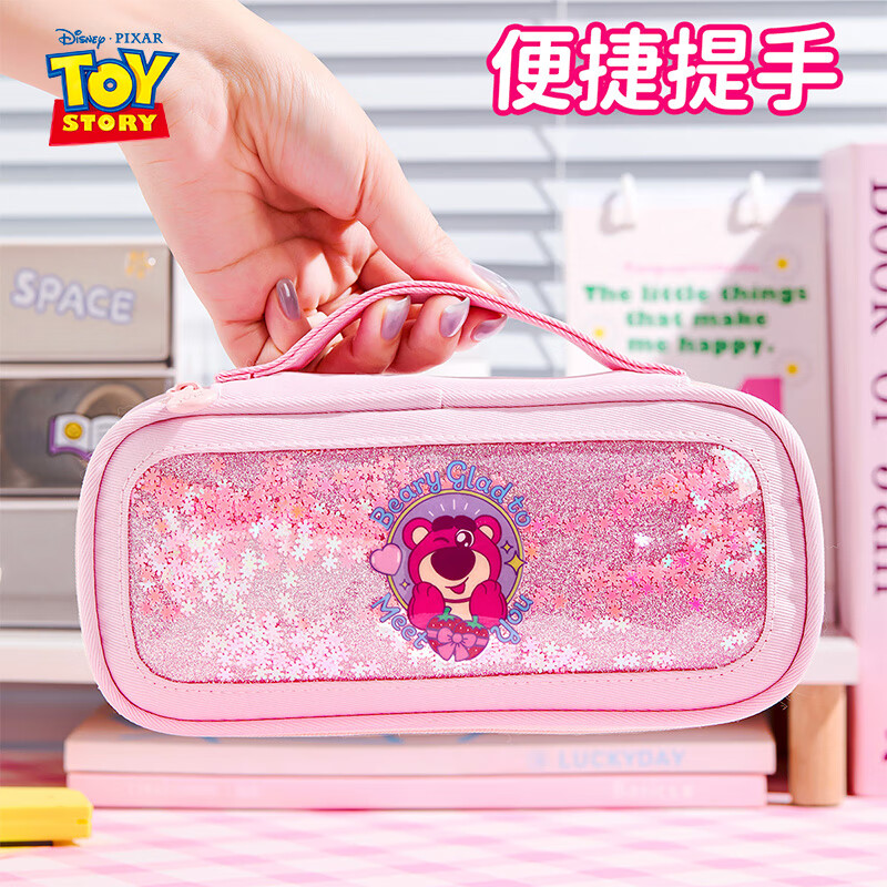 迪士尼(Disney)小学生笔袋 手提大容量文具袋/高颜值铅笔袋/流沙文具盒笔盒 女孩学习用品收纳袋 草莓熊A83317-T1
