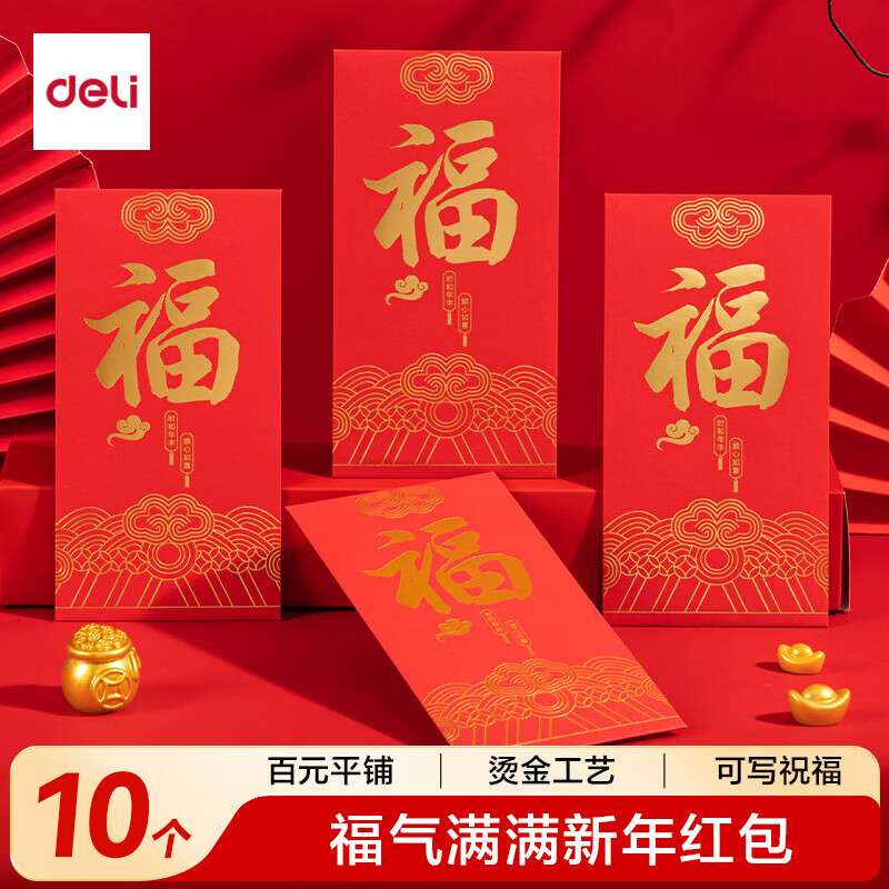 得力(deli)红包袋马年2026年新版结婚红包袋创意个性婚庆婚礼用品新年红包奖学金奖励宣纸红包新年祝福 千元红包-福到新春丨10个装 170*90mm