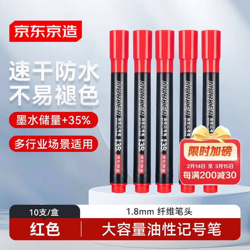 京东京造大容量油性记号笔红色10支装 大头粗头物流快递办公会议马克笔速干防水油性笔升级墨量 JD1627