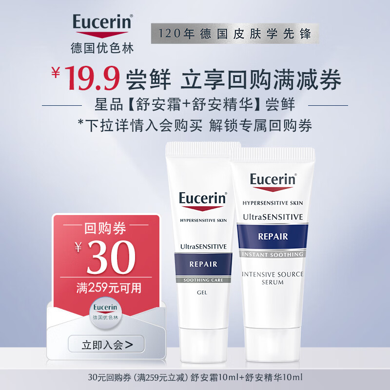 优色林(Eucerin)舒安修护霜10ml+舒安修护精华10ml+30元回购券【付费试用】