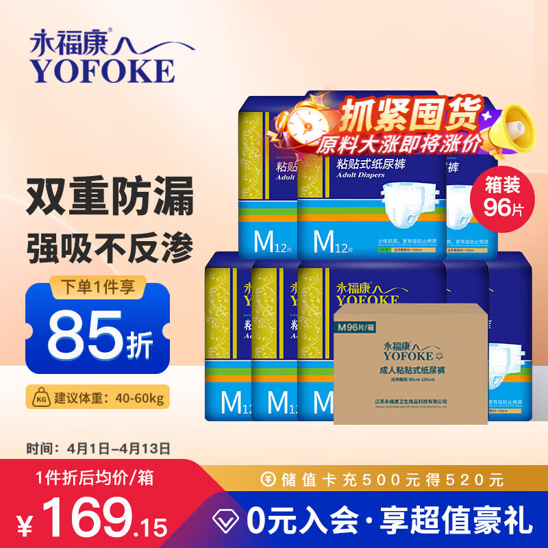 永福康成人纸尿裤M96片 臀围80-105cm 老人尿不湿 孕产妇粘贴式纸尿裤