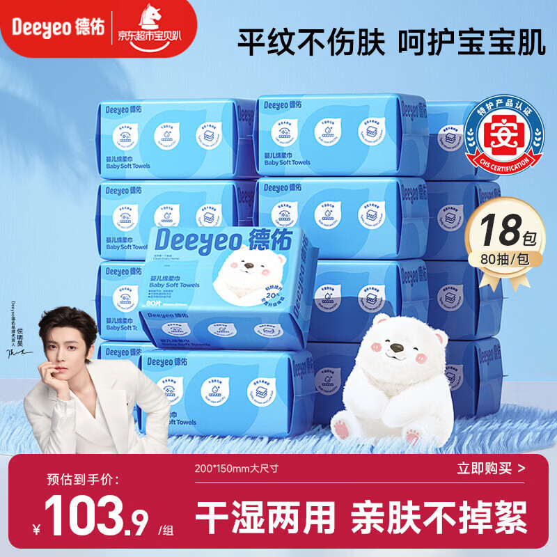 德佑婴儿绵柔巾一次性洗脸巾干湿两用加厚洁面纸巾80抽*18包小熊巾