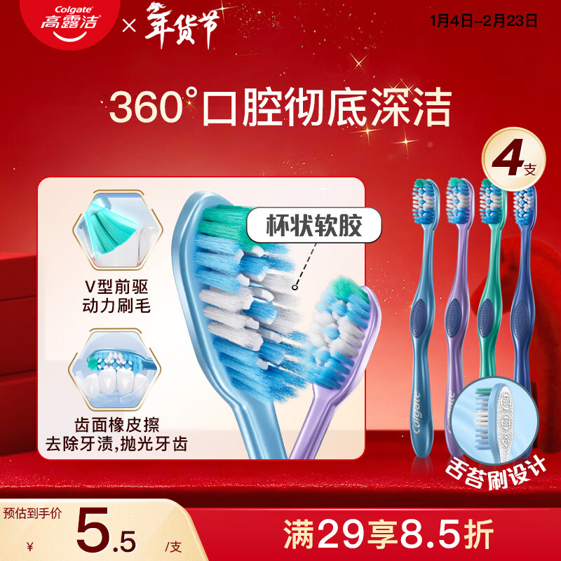 高露洁(Colgate)360°全面口腔清洁成人牙刷2支装X2(软刷清洁舌苔 细菌倍减)