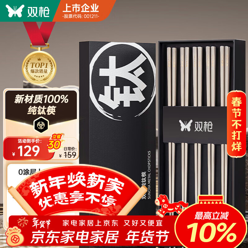 双枪100%纯钛筷子 家用高档金属筷钛质中空防烫防滑轻量便携餐具套装