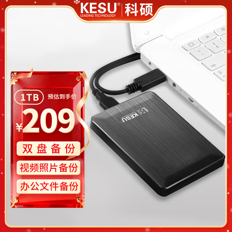科硕(KESU)1TB 移动硬盘大容量 双盘备份 USB3.0 外接机械硬盘 海量存储 手机连接 2.5英寸