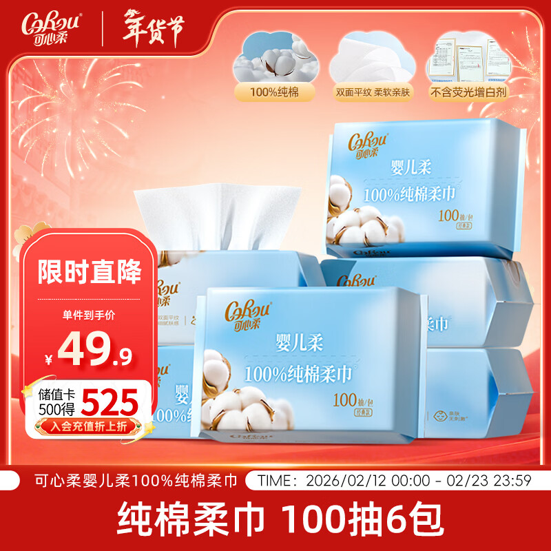 可心柔(COROU)全棉棉柔巾 纯棉洗脸巾 宝宝婴儿棉柔巾 100抽*6包