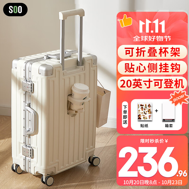SOO铝框行李箱高颜值拉杆箱小型旅行箱密码箱登机箱带杯架白色20英寸