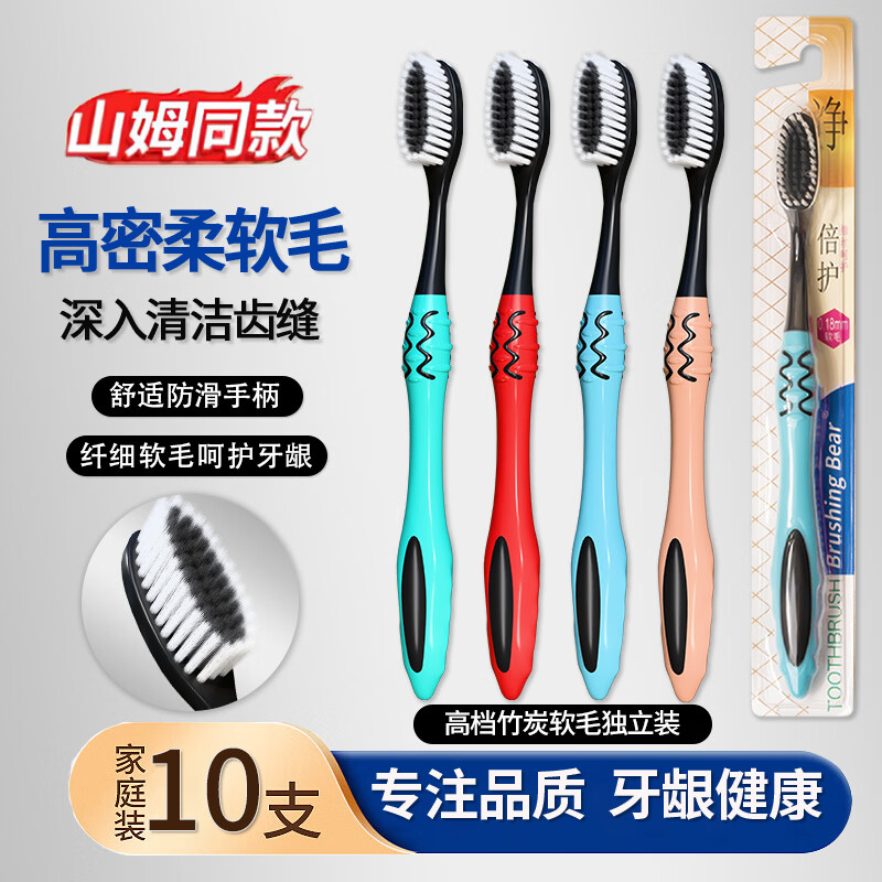BRUSHING BEAR 山姆同款牙刷软毛炭丝护龈成人家庭装家用男女士专用10支独立装