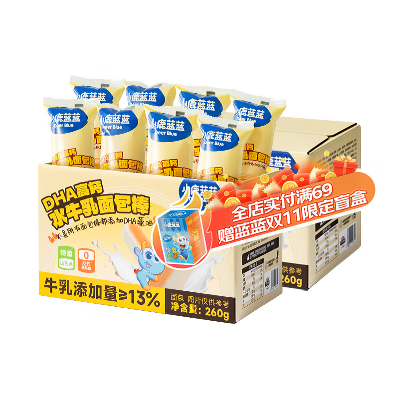 小鹿蓝蓝DHA高钙水牛乳注心面包棒 醇正奶香松软有料 特添山药泥 【早餐必备】注心面包棒2箱/520g