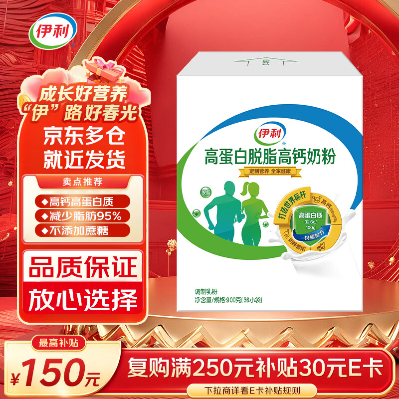 伊利高蛋白脱脂高钙奶粉900克男女学生全家营养早餐独立小袋