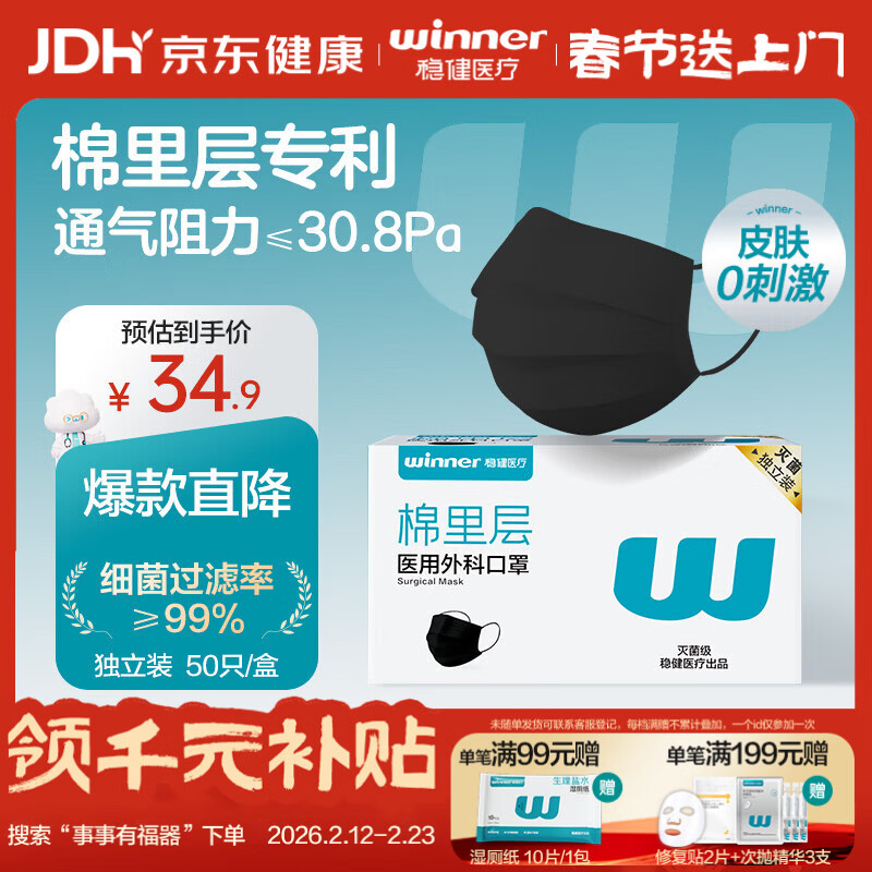 稳健棉里层医用外科口罩灭菌级独立装一只一袋50只 防花粉过敏性鼻炎