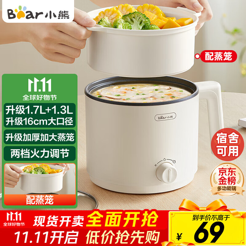 小熊(Bear)电煮锅 宿舍小电锅 电蒸锅 学生寝室一体泡面锅小火锅 多功能锅 V17C2 1.7L配蒸笼【国家补贴】