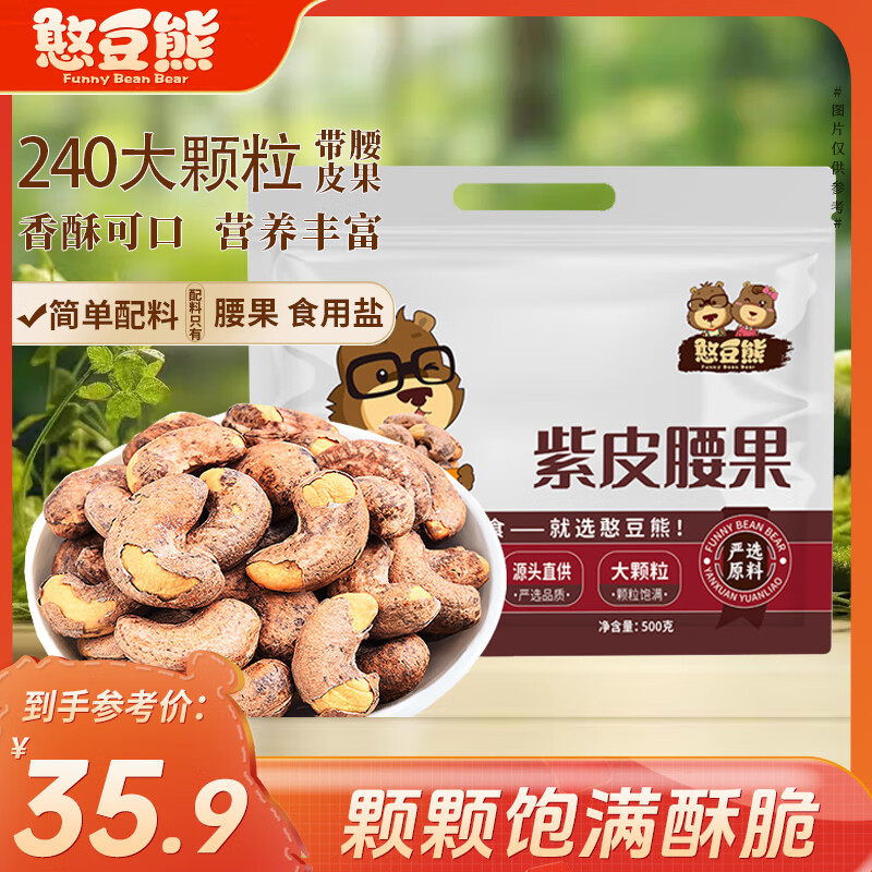 憨豆熊装袋紫皮腰果仁500g 原味每日坚果炒货干果带皮休闲零食年货送礼